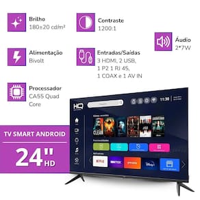 - Conectividade: Conecte a redes sem fio em alta velocidade e garanta extrair o máximo da sua Smart TV 24". Além disso, ela conta com 3 saídas HDMI e conversor digital Externo (adaptador).