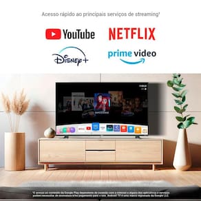 Equipada com o sistema operacional Android TV, oferece acesso rápido e intuitivo aos principais aplicativos de streaming, como Netflix, YouTube, Prime Video, Disney+ e Globoplay, além de permitir comandos de voz com o Google Assistente.