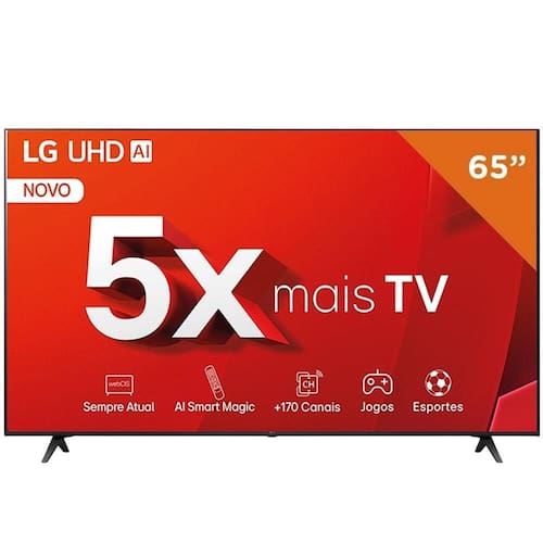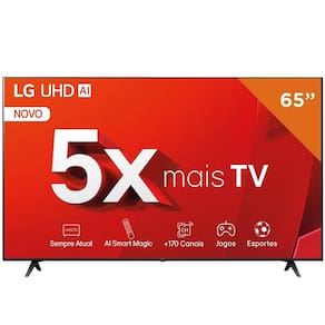 Smart TV LG 65 Polegadas, 4K UHD, LED, UT8050PSA, AI 5 4K Gen7, HDR10 / HLG, AI Brightness, Filmmaker Mode, 4K Upscaling, Wi-Fi 5, Bluetooth (v. 5.1), Bivolt (110 e 220 Volts), 12 meses de garantia.Vendido e entregue por Casa & Video