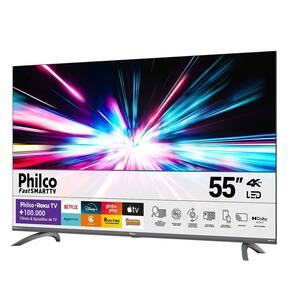 Características: Smart TV Marca: Philco Modelo: PTV55G3ERSGB Linha: Roku TV Conexões: USB; HDMI; P2; Bluetooth; Rede Consumo Aproximado de Energia: 10,5 kWh Quantidade de Óculos 3D: Não possui Sistemas de Cor: PAL-M, PAL-N, NTSC Tamanho da Tela: 55 Polegadas Código da Certificação: 01577-22-11928