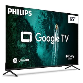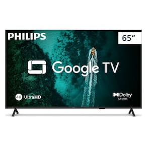 Smart TV Philips 65 polegadas com resolução 4K, Google TV, comando de voz, processador Quad Core, painel LED, design sem bordas, frequência 60 Hz, proporção de tela 16:9, ângulo de visão 178º, brilho 300 cd/m², taxa de contraste dinâmico 1:200.000, tempo de resposta 8 ms.Vendido e entregue por Lojas MM