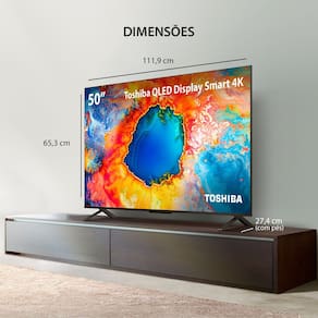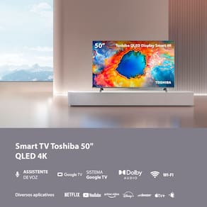 Smart TV Toshiba 50 polegadas 4K QLED com Google TV, sistema operacional rápido e completo com acesso aos principais aplicativos, som Dolby Audio com Dolby Vision Atmos, espelhamento de tela, controle parental, controle remoto com comando de voz e botões de atalho, design superslim, diversas opções de conexão.Vendido e entregue por Multi Oficial