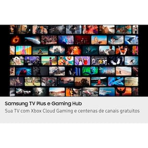 A experiencia sonora e igualmente impactante: com som adaptativo e tecnologia de movimento virtual, a TV entrega audio sincronizado em 2 canais com potencia RMS de 20W, proporcionando uma imersao completa. Alem disso, ela reune uma serie de recursos inteligentes, como Bixby, Alexa integrada, Samsung TV Plus e Samsung Gaming Hub, alem de oferecer suporte para espelhamento de smartphone e AirPlay. Com seu design elegante com bordas infinitas e base sofisticada em preto esta Smart TV une tecnologia, conectividade e estilo para elevar seu entretenimento ao maximo.