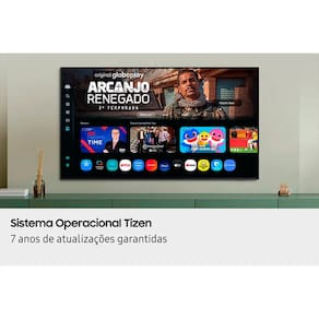 A experiencia sonora e igualmente impactante: com som adaptativo e tecnologia de movimento virtual, a TV entrega audio sincronizado em 2 canais com potencia RMS de 20W, proporcionando uma imersao completa. Alem disso, ela reune uma serie de recursos inteligentes, como Bixby, Alexa integrada, Samsung TV Plus e Samsung Gaming Hub, alem de oferecer suporte para espelhamento de smartphone e AirPlay. Com seu design elegante com bordas infinitas e base sofisticada em preto esta Smart TV une tecnologia, conectividade e estilo para elevar seu entretenimento ao maximo.