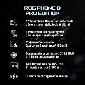 Supere seus limites com o novo ROG Phone 8 Pro Edition. Equipado com a poderosa plataforma móvel Qualcomm Snapdragon 8 Gen 3, este smartphone conta com 24 GB de memória RAM e 1 TB de armazenamento. Sua gameplay vai atingir um novo patamar com FPS no máximo, inclusive nos jogos mais pesados.