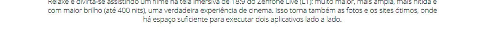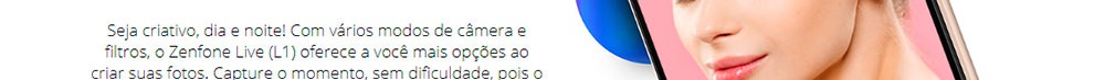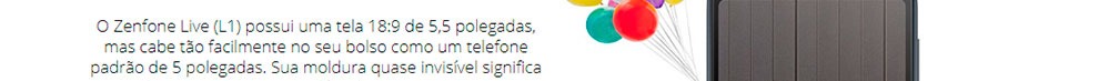 Aqui está um smartphone para quem deseja mais tela, mais energia e mais diversão. O Asus Zenfone Live L1 tem uma tela grande de 5,5 polegadas com resolução de 720 x 1440 e proporção de 18:9 pixels, que além de ser muito mais confortável de usar, a parte frontal é melhor aproveitada, sendo praticamente só tela.