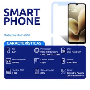 Se voce quer um celular que une desempenho inteligente, muita memoria interna e uma bateria que nao te abandona no meio do dia, o Moto G06 com 256GB de armazenamento e a escolha certa. Ele chega com tudo: tela grande, som estereo, Android atualizado e uma camera de 50 MP que te acompanha em qualquer situacao. Um smartphone completo e acessivel, feito para quem nao quer limites.