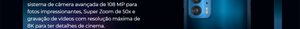 Sua câmera traseira principal, com sensor de 108 MP, captura cada detalhe da imagem sem perder a qualidade, possui zoom óptico de 5x ou digital de 50x. E conta também com uma câmera híbrida (Ultra-wide e Macro) de 16 MP e uma câmera teleobjetiva de 8 MP. Já a câmera frontal registra selfies de até 32 MP.
