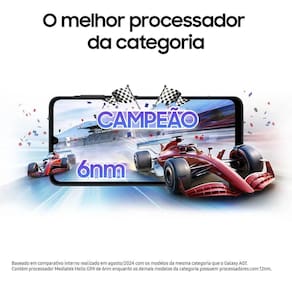 O Galaxy A07 chega para redefinir o que você espera de um smartphone feito para durar, entregando o melhor processador da categoria, câmera dupla de até 50MP, até 6 atualizações de Android e até seis anos de atualizações de segurança, proteção IP54 contra água e poeira, design fino e recursos que acompanham seu ritmo.Com o processador Mediatek Helio G99 de 6nm e a memória RAM de 4GB + 4GB de RAM Plus (RAM virtual), você roda os seus apps, jogos, vídeos sem travar. O processador tem performance 84% superior a versão anterior (G85). Ainda conta com 128GB de armazenamento para seus vídeos, fotos e apps.Sua câmera dupla de até 50MP é capaz de fazer fotos em alta resolução trabalha em conjunto com uma câmera de profundidade permitindo efeitos incríveis para suas fotos. E com a câmera frontal de 8MP você tira selfies perfeitas.Feito para durar e atualizado por mais tempo, o Galaxy A07 oferece até 6 atualizações de sistema operacional Android e até 6 anos de atualizações de segurança.Além disso, conta com proteção IP54, garantindo resistência à água e poeira.Sua tela ampla de 6,7", HD+, com vidro temperado reforçado e taxa de atualização de 90 Hz, garante resistência e cores vivas e vibrantes, além de ter uma imersão total em filmes, séries e redes sociais.O seu acabamento sofisticado e fino, com espessura de 7,6mm e apenas 184g traz conforto e ergonomia.Equipado com sua bateria de longa duração de 5000 mAh, o Galaxy A07 te acompanha em todos os cantos e permite que você esteja sempre conectado.Com o aplicativo SmartSwitch você transfere de forma fácil e prática o conteúdo do seu celular anterior (fotos, contatos, eventos do calendário, notas, configurações do dispositivo e muito mais).Sua segurança é aprimorada através do Samsung Knox Vault, garantindo que dados confidenciais e sigilosos, como senhas e pins de desbloqueio, permaneçam seguros.
