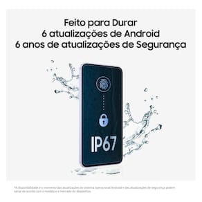 DESCRIÇÃO RESUMIDA O Samsung Galaxy A36 5G é um smartphone projetado para longevidade e desempenho. Ele se destaca pela promessa de até 6 gerações de atualizações do sistema Android e 6 anos de atualizações de segurança. Com uma tela Super AMOLED de 6,7 polegadas, oferece cores vibrantes e fluidez para navegação e mídia. O aparelho integra recursos avançados de Inteligência Artificial, como o ""Circule para Pesquisar"" e edição inteligente de fotos. Possui certificação IP67 contra água e poeira, além de uma bateria robusta de 5000mAh para acompanhar a rotina.
