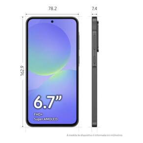 Especificações: Cor: Preto Tela: 6,7"" Super AMOLED, 16M de cores Processador: Octa-Core (Snapdragon) com velocidade de até 2.4 GHz Memória RAM: 8 GB (com suporte a RAM Plus de até 8 GB) Armazenamento Interno: 256 GB Segurança: Sensor de Impressão Digital e Reconhecimento Facial Câmera Traseira: Tripla de 50 MP (Principal) + 8 MP (Ultra Wide) + 5 MP (Macro) Câmera Frontal: 12 MP Bateria: 5.000 mAh Sistema Operacional: Android 15 Conectividade: 5G, Wi-Fi, Bluetooth 5.3, NFC e USB Tipo-C Chip: Dual SIM (Nano-SIM 4FF) Vídeo: Gravação e reprodução em UHD 4K (3840 x 2160) @30fps Diferenciais: Inteligência Artificial (Galaxy AI), Resistência à água e poeira (IP67), e suporte de longo prazo para atualizações (6 anos). Dimensões: 16 x 8 x 7 cm (AxLxC)