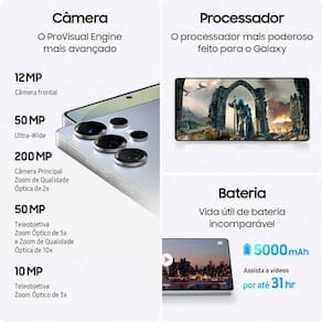 Recursos da Câmera: 200MP (Wide) + 50MP (Ultra Wide) 10MP (Tele) + 50MP (Tele)