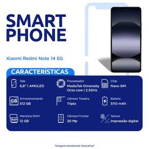 Smartphone Xiaomi Redmi Note 14 5G 6.67 Polegadas 512GB 12GB Câmera Tripla Quadriband