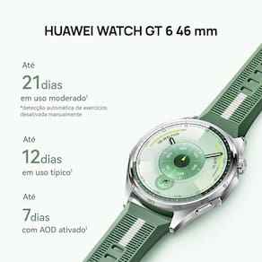 Smartwatch Huawei GT6 de 46mm na cor Preta, com tela colorida AMOLED de 1,47 polegadas (46 mm) e resolução 466x466 pixels (317 PPI). Possui sistema operacional Harmony OS, conectividade NFC e Bluetooth 6.0, e GNSS L1/L5 (GPS, GLONASS, GALILEO, BDS, QZSS). Armazenamento interno de 64 GB e 64 MB de RAM. Caixa em aço inoxidável (cor prata) com pulseira em fluoroelastômero (cor preta), ajustável para pulsos de 140 a 210 mm. Bateria recarregável Li-ion com duração de até 21 dias (uso máximo), até 12 dias (uso normal), até 7 dias (com AOD) ou até 40 horas (modo esportes ao ar livre). Carregamento sem fio. Resistente à água 5 ATM e à poeira IP69. Inclui alto-falante, microfone, botão Home (coroa giratória) e botão lateral. Sensores: acelerômetro, giroscópio, magnetômetro, frequência cardíaca, barômetro, temperatura, luz ambiente. Compatível com Android 9.0 ou posterior e iOS 13.0 ou posterior. Modelo: Atum-B19F. Dimensões do produto sem embalagem (AxLxP): 464610,95 mm. Peso do produto sem embalagem: 0,07 kg.Processador
