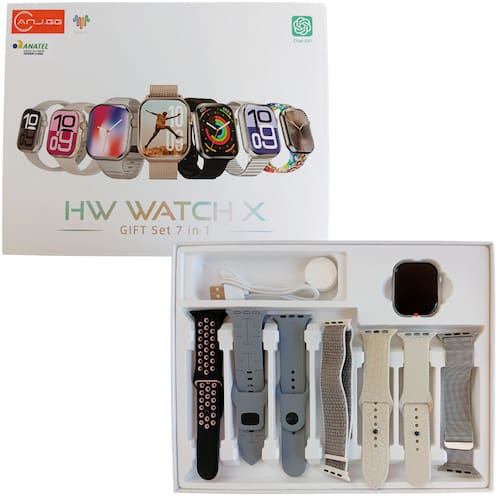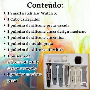 Smartwatch HW Watch X 46mm com tela de 2” HD, monitoramento de saúde (frequência cardíaca, pressão arterial, oxigênio no sangue, sono), conectividade Bluetooth para chamadas e notificações, modos esportivos, NFC, compatibilidade iOS/Android e carregamento por indução.Processador