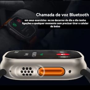 Smartwatch com tela grande de 2.02 polegadas, chamadas via Bluetooth, assistente de voz, notificações em tempo real, medições de saúde (oxigênio no sangue, sono), modos esportivos, lembretes inteligentes, resistência à água IP65 e carregamento sem fio.Processador