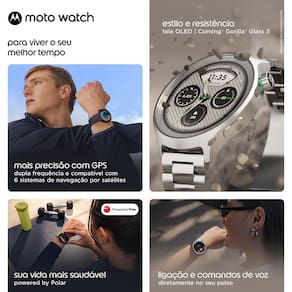 - Smartwatch Motorola Moto Watch XT2547 - Dimensões: 47 x 47 x 12 mm - Tela: OLED 1.4” - Resolução: 466 x 466 pixels - Proteção: Corning Gorilla Glass 3 - Compatibilidade: Android 12 ou superior - Software: Powered by Polar - Sensores: Acelerômetro, Giroscópio, Bússola, Luz Ambiente, PPG - Conectividade: Bluetooth 5.3 - Localização: GPS (L1+L5), GLONASS, BEIDOU, Galileo, NavIC, QZSS - À Prova d'água : IP68 - Capacidade da bateria: 450 mAh - Bateria: Até 13 dias (variável conforme uso) - Dimensões: 47 x 47 x 12 mmSim Card