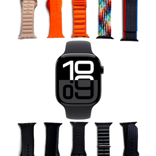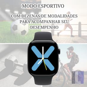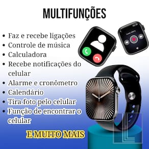 Smartwatch W10 Laxasfit com tela sensível ao toque, conectividade Bluetooth para chamadas, controle de música e câmera remota. Inclui 10 pulseiras intercambiáveis para variar o visual. Monitora atividades diárias, sono (estimado), passos, distância e gasto calórico. Exibe notificações de chamadas, mensagens e aplicativos. Possui alarme, lembretes, cronômetro, temporizador e calculadora.Processador