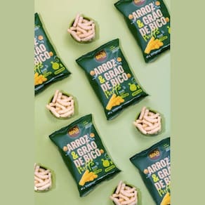 Salgadinho assado a base de grão de bico, arroz e aroma natural de cebola e salsa.