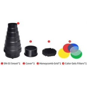 Snoot com montagem do tipo Bowens O Snoot é feito de liga de alumínio de alta qualidade, durável e firme. Ajuda a contentrar o facho de luz na área que você desejar. Compatível com montagem tipo Bowens Acompanha colmeia para direcionamento ainda maior da luz 5 Filtros coloridos: azul, vermelho, verde, amarelo e branco Marca: F32