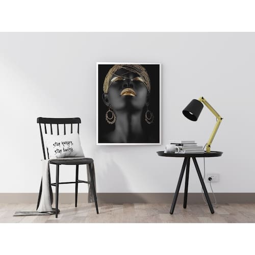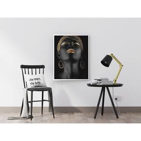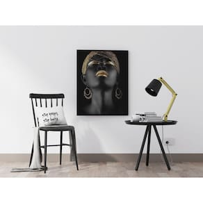 Estes quadros exaltam a beleza e a força das mulheres negras, destacando detalhes em tons dourados que trazem um toque de sofisticação e empoderamento. A combinação das cores transmite luminosidade, elegância e celebração da diversidade.