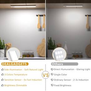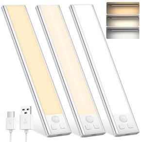 Luzes sob armário com sensor de movimento LED para armário - ?Iluminação lateral e luz brilhante e suave?As luzes DEALGADGETS sob o armário com 29 contas de lâmpada LED adotam um novo processo de produção de emissão de luz na lateral, que refrata a luz para a placa guia de luz através do refletor e depois distribuídas uniformemente na superfície da lâmpada através da placa difusora. A luz será mais brilhante e suave sem brilho, protegendo assim seus olhos. Estas luzes embaixo do armário são feitas de liga de alumínio, resistentes ao uso. - ?Brilho regulável e 2 modos de funcionamento?Estas luzes LED para armário suportam ajuste de brilho de 3 níveis e 10%-100% de regulação contínua, para que você possa personalizar o brilho de acordo com diferentes necessidades de iluminação. 2 modos de trabalho podem ser selecionados por um botão nestas luzes adesivas no armário. Sob o modo de sensor de movimento, estas luzes sob balcão detectarão automaticamente o movimento humano dentro de uma faixa de 3 m/100° e desligarão automaticamente após 20 segundos sem movimento em ambientes escuros. - ?Recarregável com USB-C e economia de energia?Estas luzes LED operadas por bateria têm uma bateria recarregável de alta capacidade embutida de 1000 mAh, recarregável USB-C padrão e podem ser facilmente carregadas no computador, carregador portátil ou tomada USB através do cabo USB (incluído). A luz vermelha indica o carregamento, a luz verde indica que está totalmente carregada. Leva apenas de 3 a 4 horas para carregar totalmente e acende por 5 a 80 horas no modo sempre ligado (dependendo do brilho) ou de 7 a 25 dias no modo sensor de movimento (dependendo da frequência de uso). - ?Design ultrafino e fácil instalação?O sensor de movimento de luz embaixo do armário tem apenas 9 mm de espessura e seu tamanho compacto o torna versátil, fornecendo luz para espaços apertados e cantos escuros. Com ímãs embutidos, a luz sob balcão pode grudar em qualquer ferro ou você pode usar as folhas de ferro incluídas com fita adesiva para colar em qualquer superfície que não seja passada. Quando precisar carregar ou trocar de lugar, você pode tirar a luz do armário a qualquer momento. - ?Ampla aplicação?Esta luz de armário com sensor de movimento LED é ideal para quarto, quarto de bebê, escadas, cozinha, armário, armário, corredor, oficina, porão, garagem e outros lugares. Você receberá 3 luzes sob o balcão, 3 cabos de carregamento, 6 folhas de ferro com fita adesiva para instalação e 1 x instruções de uso. Você desfrutará de substituição vitalícia e serviço amigável 24 horas. Sinta-se à vontade para entrar em contato conosco se tiver algum problema!