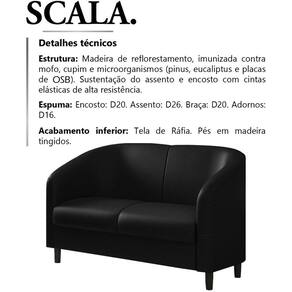 Sofa 120 cm 2 Lugares Scala Corano, é a escolha certa para você complementar sua sala, tornando o ambiente em que estiver muito mais luxuoso e versátil. Estrutura em madeira de reflorestamento (pinus, eucaliptos e placas de OSB) e cintas elásticas de alta resistência. Composta por madeira imunizada contra mofo, cupim e microrganismos, revestimento em tecido corano, encosto em espuma D-20, assento em espuma D-26, braça em espuma D-20, adornos em espuma D-16, acabamento inferior em tela de ráfia, e 4 pés em madeira tingidos. Suportando até 130 kg por assento. Possui design moderno que transmitira elegância e charme em sua decoração. Este móvel chegará na sua casa separado em 01 volume.