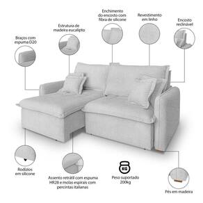 Assento: Retrátil com percintas elásticas italianas, molas bonel, espuma HR28 + plumante em silicone