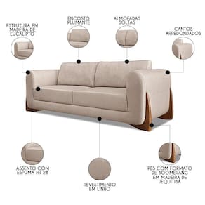 O Sofá Living é revestido em linho de alta qualidade, proporcionando uma textura agradável ao toque. Os pés do sofá são um destaque à parte, com acabamento em madeira de jequitibá, conhecida por sua durabilidade e beleza natural. A estrutura é feita de madeira maciça de eucalipto, garantindo resistência e durabilidade. O assento é em espuma HR28, complementada por plumante em silicone, oferecendo um equilíbrio perfeito entre suporte e maciez. O design dos pés em formato boomerang, com 8 cm de altura na cor mel, adiciona um toque retro-moderno à peça. Este Sofá 2 Lugares não é apenas um móvel, mas uma peça de decoração que reflete sofisticação e um padrão de acabamento de alto nível para a sua Sala de Estar.