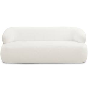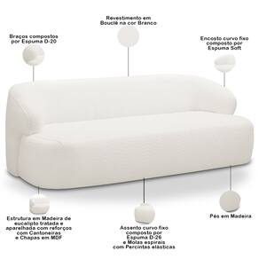Características: Estrutura em madeira de eucalipto tratada e aparelhada com reforços, cantoneiras e chapas em MDF. Revestimento em tecido Bouclê de alta qualidade na cor Branco. Encosto curvo fixo composto por espuma soft. Assento curvo fixo composto por espuma D-26 e molas espirais. Percintas elásticas no assento para maior resistência e durabilidade. Pés em madeira. Peso suportado: Até 120 kg por assento.