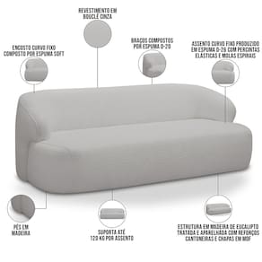 Características: Estrutura em madeira de eucalipto tratada e aparelhada com reforços, cantoneiras e chapas em MDF. Revestimento em tecido Bouclê de alta qualidade na cor Cinza. Encosto curvo fixo composto por espuma soft. Assento curvo fixo composto por espuma D-26 e molas espirais. Percintas elásticas no assento para maior resistência e durabilidade. Braços compostos por espuma D-20. Pés em madeira. Peso suportado: Até 120 kg por assento.