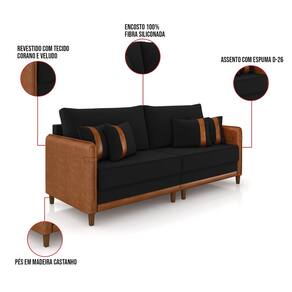 O Sofá 2 Lugares Living Valença é a escolha perfeita para quem busca um equilíbrio entre conforto e elegância em um espaço compacto. Com medidas de 172 cm, este sofá se destaca pelo design modulado e pela qualidade de seus materiais. O sofá é revestido em tecido sintético PU na cor Nozes, com um acabamento em Veludo Preto que proporciona um toque de sofisticação e aconchego. O sofá é fabricado com madeira de reflorestamento tratada, especificamente eucalipto. Já os pés são de madeira na cor castanho, com acabamento elegante que complementa o visual geral do móvel. O sofá possui assento e encosto fixos, garantindo uma estrutura sólida e sem movimento. A espuma utilizada é a D-28, conhecida por sua durabilidade e conforto. O assento é fixo, que garante um suporte firme e duradouro. Ele é equipado com molas espirais e percintas elásticas, além de uma manta acrílica que oferece um conforto extra. Este assento é projetado para suportar até 150 kg, garantindo robustez e estabilidade. O encosto é fixo e conta com percintas elásticas que sustentam almofadas soltas preenchidas com 100% fibra siliconada, proporcionando um apoio macio e confortável para as costas. Além do mais, as almofadas do encosto do sofá são adornadas com uma fita em sintético PU que segue a mesma tonalidade do revestimento, na cor Nozes. Este detalhe não apenas realça o design do sofá, mas também oferece uma finalização elegante e refinada. Os braços do sofá são preenchidos com espuma D-23, o que proporciona um suporte confortável e equilibrado. A estrutura dos braços complementa o design do sofá, oferecendo uma superfície acolhedora para descansar os braços. Para garantir a durabilidade e resistência, os pontos de tensão do sofá são fixados com grampos galvanizados antiferrugem ou aparafusados, garantindo que o móvel mantenha sua integridade ao longo do tempo. A combinação desses materiais assegura um suporte ergonômico, ideal para relaxar após um longo dia. Invista no conforto e na sofisticação que você merece, o Sofá Valença está esperando por você!"