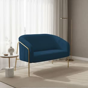 Sofá 2 Lugares Namoradeira Stella Base Industrial Alta Dourada Bouclê Azul D03 - D'rossi A Namoradeira Stella Base Alta Bouclê Azul é um móvel que une design moderno, conforto e sofisticação, ideal para compor salas de estar, recepções e ambientes decorativos. Seu formato elegante e estrutura elevada valorizam o espaço, trazendo leveza e requinte à decoração. Produzida com estrutura em madeira de eucalipto reflorestado e base em aço tubular na dourada, garante durabilidade, estabilidade e resistência. O assento em espuma D-26 proporciona firmeza e conforto, enquanto o encosto e os braços em espuma D-23 oferecem um toque macio e ergonômico, se adaptando perfeitamente a diferentes estilos de decoração, do clássico ao contemporâneo. A namoradeira é perfeita para quem busca um sofá pequeno e sofisticado, unindo beleza, qualidade e conforto. O acabamento refinado e o design atemporal fazem dessa peça uma excelente escolha para transformar o ambiente com elegância e estilo. Dimensões do Produto: