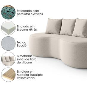 Sofá Ibiza combina conforto e estilo com design orgânico, valorizando formas suaves e aconchegantes. Com estrutura em Madeira Maciça Eucalipto (reflorestada) e reforçada com percintas elásticas. Estofado em espuma HR-26 (assento e encosto), revestido em tecido Bouclé (material com textura macia e aconchegante) e 3 almofadas soltas com enchimento em fibra de silicone. Suporta até 130 kg por assento. Demais decorações não inclusas! Produto será entregue em 1 volume.