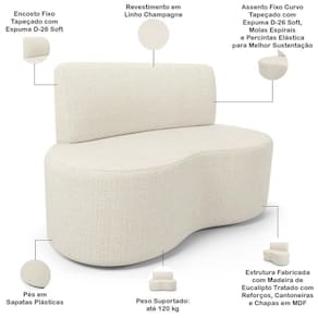 SizeDescription: Altura: 85 cm x Largura: 138 cm x Profundidade: 70 cm | ColorSupplier: Champagne | Model: Larissa | Color: Bege | SupplierSimpleName: Sofá 2 Lugares Orgânico Para Sala de Estar Living Larissa L02 Linho Champagne - Lyam Decor | ColorSimple: Bege | Cor: Champagne | MaterialFamily: Madeira, MDF, Linho e espuma | ColorFamily: Bege | ProductWarranty: 90 dias após o do produto | ProductHeight: 85 cm | OriginCountry: | ProductWidth: 138 cm | OriginState: PR | ProductWeight: 34 kg | ProductContents: 1 Sofá | ProductLength: 70 cm | Material: Estutura em Madeira, MDF, Revestimento em Linho e espuma | ProductInstructions: Produto para uso em ambiente interno, nao devendo ficar exposto ao sol, calor e umidade excessivos. | Material do estofamento: Espuma D-26 Soft | Densidade da espuma do assento: Espuma D-26 Soft | Fabricante: Lyam Decor | Estilo: Moderno | Desenho do tecido: Liso | Unidades por kit: 1 | Com tecido removível: NA | Orientação do Sofá: na | Altura: 85 cm | Formato do sofá: Curvo | Com pés desmontáveis: NA | Tipo de produto: Sofá | Material de enchimento do encosto: Espuma D-26 Soft | Inclui manual de montagem: Não | Quantidade de Caixas de embalagem: 1 | Peso máximo suportado: 120 kg | Peso: 34 Kg | Cor dos pés: NA | É sofá na caixa: NA | Linha: Sala de Estar, Living | Largura: 138 cm | Profundidade: 70 cm | Mecanismo de abertura do produto: na | Requer montagem: Não | Inclui colchão: NA