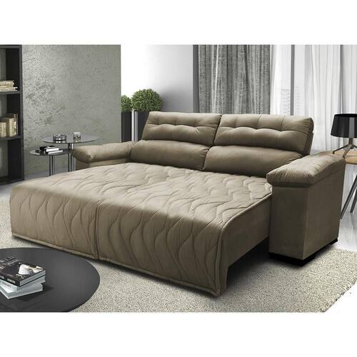 Sofá 2,02m Retrátil E Reclinável Com Molas Cama Inbox Top Tecido Suede Velusoft Castor Um modelo exclusivo e requintado, o sofá Cama inBox Top é um modelo maravilhoso. Com design único e inovador, todo o seu assento é feito com bordado pantográfico, dando um toque mais elegante e moderno a este modelo. Feito com espuma D33 e envolvida com manta grossa de fibra siliconada, seu conforto e qualidade são garantidos. Sinta-se abraçado(a) pelo conforto do Maravilhoso Sofá Cama inBox Top! Características: -Encosto Reclinável com 5 posições, almofadas fixas compostas de 80% fibra siliconada e 20% flocos de espuma e percintas elasticas para maior conforto. -Assentos: Retráteis com espuma D33 envolvidas em manta grossa de fibra SILICONADA compactada, Molas espiral, percintas Pneumáticas com feltro para proteger do atrito com as molas. -Braços almofadados com 80% fibra e 20% flocos de espuma. -Fixação: Grampos galvanizados -Estrutura de Madeira maciça 100% eucalipto de reflorestamento, produto ecologicamente correto -Tecido suede com toque aveludado