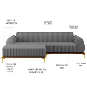 Marca: Domi | ProductWarranty: 90 dias após o do produto | Cor: Cinza Escuro | Material: Madeira Reflorestada | Altura: 76 cm | Largura: 245 cm | Profundidade: 85 cm | Peso: 83 kg | Gênero: Unisex | Manual: Sim | Origem: | Requere montagem: Sim | SupplierSimpleName: Sofá 245cm 4 Lugares com Chaise Esquerdo Pés Gold Molino C-416 Linho Cinza Escuro - Domi | Model: Molino | Color: Cinza Escuro | ColorFamily: Cinza Escuro | ColorSimple: Cinza Escuro | ColorSupplier: Cinza Escuro | MaterialFamily: Madeira Reflorestada | ProductHeight: 76 | ProductWidth: 245 | ProductLength: 85 | ProductWeight: 83 | ProductInstructions: Produto para uso em ambiente interno, nao devendo ficar exposto ao sol, calor e umidade excessivos. | ProductContents: 1 Sofá | AssemblyRequired: Sim, sugerimos a contratação do nosso de montagem (para os CEPs em que o está dispon | SizeDescription: 76 x 245 x 85 cm | OriginState: PR | OriginCountry: | Tipo de Garantia: Fabricante | Peso Suportado: 120 kg