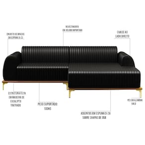 ProductWeight: 87 | Manual: Sim | ColorFamily: Preto | Profundidade: 85 cm | Color: Preto | ColorSimple: Preto | MaterialFamily: Madeira Reflorestada | ProductLength: 85 | ColorSupplier: Preto | Altura: 76 cm | Largura: 255 cm | Peso: 87 kg | Requere montagem: Sim | ProductWarranty: 90 dias após o do produto | ProductInstructions: Produto para uso em ambiente interno, nao devendo ficar exposto ao sol, calor e umidade excessivos. | ProductContents: 1 Sofá | AssemblyRequired: Sim, sugerimos a contratação do nosso de montagem (para os CEPs em que o está dispon | OriginCountry: | OriginState: PR | Marca: Domi | Tipo de Garantia: Fabricante | Peso Suportado: 120 kg | ProductWidth: 255 | Model: Molino | Gênero: Unisex | SupplierSimpleName: Sofá 255cm 4 Lugares com Chaise Direito Pés Gold Molino B-159 Corano Preto - Domi | ProductHeight: 76 | Cor: Preto | Origem: | Material: Madeira Reflorestada | SizeDescription: 76 x 255 x 85 cm