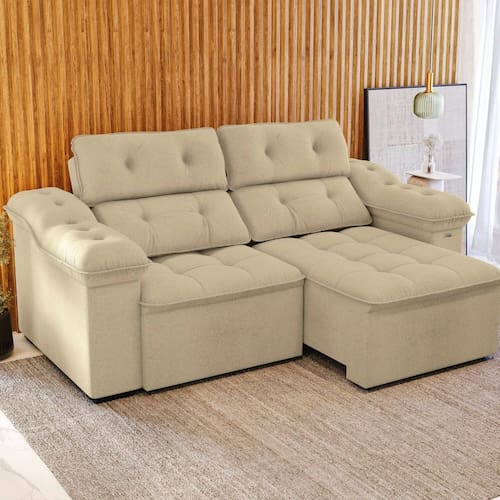 Para conforto e beleza em todos os momentos, aposte no Sofá Sierra 2,6m da Kappesberg. Robusto e confortável, ele é produzido em estrutura resistente, e seus diferenciais ficam por conta do sitema de rodízios e trilho de madeira, facilitando o manuseio. Além disso, com molas ensacadas, ele é retrátil e articulável em seis posições, proporcionando o ajuste conforme a sua preferência. Com espumas certificadas, os assentos, encostos e apoios de braço contam com enchimento em fibras e flocos de espumas, garantindo muito conforto. Medindo 1,33m de altura, 2,6m de largura e 1,32m de profundidade, o sofá é revestido em tecido Bouclé Bege, garantindo um toque suave e gostoso, suportando até 120kg por assento. Os destaques ficam para para os puxes, que garantem beleza e um acabamento único.