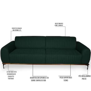 Altura: 76 cm | AssemblyRequired: Sim, sugerimos a contratação do nosso serviço de montagem (para os CEPs em que o serviço está dispon | Color: Verde Musgo | ColorFamily: Verde Musgo | ColorSimple: Verde Musgo | ColorSupplier: Verde Musgo | Cor: Verde Musgo | Gênero: Unisex | Largura: 260 cm | Manual: Sim | Marca: Domi | Material: Madeira Reflorestada | MaterialFamily: Madeira Reflorestada | Model: Molino | Origem: Nacional | OriginCountry: Nacional | OriginState: PR | Peso: 50 kg | Peso Suportado: 120 kg | ProductContents: 1 Sofá | ProductHeight: 76 | ProductInstructions: Produto para uso em ambiente interno, nao devendo ficar exposto ao sol, calor e umidade excessivos. | ProductLength: 89 | ProductWarranty: 90 dias após o recebimento do produto | ProductWeight: 50 | ProductWidth: 260 | Profundidade: 85 cm | Requere montagem: Sim | SizeDescription: 76 x 260 x 89 cm | SupplierSimpleName: Sofá 260cm 4 Lugares Pés Preto Molino C-117 Linho Verde Musgo - Domi | Tipo de : Fabricante