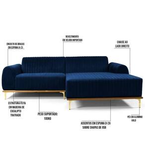 Sendo assim, o Sofá 265cm 4 Lugares Com Chaise Direito Pés Gold Molino da Domi é a escolha certeira para compor sua sala de estar! Feito em madeira de Eucalipto, encosto e assentos fixos em espuma de qualidade D-23 e D28, respectivamente, conta com design inovador e moderno para melhor aproveitamento. Além disso a sua composição não para por aí! Seu revestimento em veludo agrega um toque de modernidade ímpar ao cômodo.