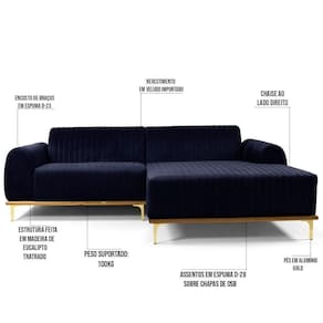Altura: 76 cm | Largura: 265 cm | Material: Madeira Reflorestada | Gênero: Unisex | Manual: Sim | Origem: | Requere montagem: Sim | SupplierSimpleName: Sofá 265cm 4 Lugares com Chaise Direito Pés Gold Molino C-287 Veludo Marinho - Domi | Color: Marinho | ColorFamily: Marinho | ColorSimple: Marinho | ColorSupplier: Marinho | MaterialFamily: Madeira Reflorestada | ProductHeight: 76 | ProductWidth: 265 | ProductLength: 85 | ProductWeight: 65 | SizeDescription: 76 x 265 x 85 cm | ProductWarranty: 90 dias após o do produto | ProductInstructions: Produto para uso em ambiente interno, nao devendo ficar exposto ao sol, calor e umidade excessivos. | ProductContents: 1 Sofá | AssemblyRequired: Sim, sugerimos a contratação do nosso de montagem (para os CEPs em que o está dispon | OriginCountry: | OriginState: PR | Marca: Domi | Tipo de Garantia: Fabricante | Peso Suportado: 120 kg | Profundidade: 85 cm | Cor: Marinho | Peso: 65 kg