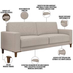 Características: Estrutura em madeira de reflorestamento (pinus, eucaliptus e placas de MDF) imunizada contra mofo, cupim e micro-organismos. Revestimento em tecido Linho de alta qualidade na cor Cru. Assento fixo tapeçados com espuma D-26 e manta acrílica. Encosto fixo com almofadas com fibras e flocos, revestidas com manta acrílica e kami. Braços tapeçados com espuma D-20. Cintas elásticas de alta resistência no assento e encosto para maior sustentação. Pés em madeira tingidos. Peso suportado: Até 120 kg por assento.