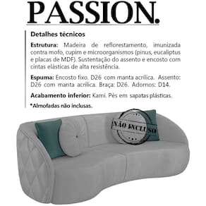 Sofa 3 Lugares 240 cm Passion Veludo, é a escolha certa para você que busca conforto e bem-estar, tornando o ambiente em que estiver muito mais elegante e moderno. Estrutura em madeira de reflorestamento (pinus, eucaliptos e placas de MDF) e cintas elásticas de alta resistência. Composto por madeira imunizada contra mofo, cupim e microrganismos, revestimento em tecido veludo, encosto fixo em espuma D-26 com manta acrílica, assento em espuma D-26 com manta acrílica, braça em espuma D-26, adornos em espuma D-14, acabamento inferior em kami, acompanha sapatas plásticas. Suportando até 130 kg por assento. Possui design diferenciado, que oferece sofisticação, versatilidade e charme ao seu ambiente. Este móvel chegará na sua casa separado em 02 volumes.