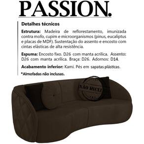 Sofa 3 Lugares 240 cm Passion Veludo, é a escolha certa para você que busca conforto e bem-estar, tornando o ambiente em que estiver muito mais elegante e moderno. Estrutura em madeira de reflorestamento (pinus, eucaliptos e placas de MDF) e cintas elásticas de alta resistência. Composto por madeira imunizada contra mofo, cupim e microrganismos, revestimento em tecido veludo, encosto fixo em espuma D-26 com manta acrílica, assento em espuma D-26 com manta acrílica, braça em espuma D-26, adornos em espuma D-14, acabamento inferior em kami, acompanha sapatas plásticas. Suportando até 130 kg por assento. Possui design diferenciado, que oferece sofisticação, versatilidade e charme ao seu ambiente. Este móvel chegará na sua casa separado em 02 volumes.
