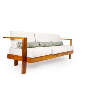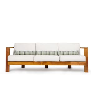 Fabricado em tecido de alta qualidade em Sarja Impermeável, seu enchimento é composto por manta fibra siliconada, estruturado por espuma ortopédica D33 para o assento e D23 para o encosto. A estrutura é produzida em madeira nobre de grápia com pintura na cor natural.