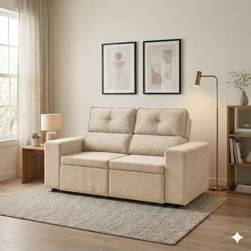Seu sistema retrátil e reclinável garante versatilidade para assistir séries, descansar ou receber visitas. O assento é composto por espuma D24, molas Bonnel e percintas elásticas, oferecendo firmeza e conforto sem deformar com o tempo.