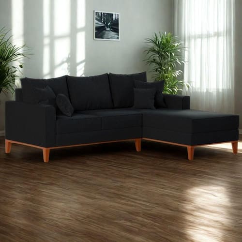 Montagem: O produto vai montado, apenas rosquear os pés e encaixar a Chaise no Sofá na peça lateral.