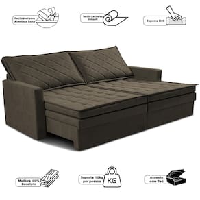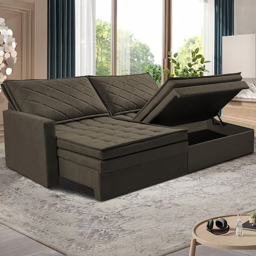 Seu assento retrátil com extensão e encosto reclinável garantem o máximo de conforto, enquanto os baús individuais sob cada assento proporcionam praticidade para armazenar mantas, almofadas e objetos diversos. Ideal para ambientes compactos, o modelo elimina a caixa tradicional, permitindo que o encosto funcione como extensão do assento.