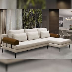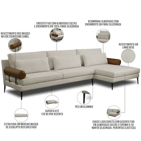 Com design moderno e cheio de charme, o Sofá 3 Lugares com Chaise 260cm Pés Industrial Malik D06 Linho Bege Couríssimo Camel, da Lyam Decor, combina cores, texturas e materiais que formam uma verdadeira obra de arte. Esse sofá com chaise possui linhas minimalistas, mas que chamam a atenção por sua singularidade, a começar pelos pés metálicos que remetem ao estilo industrial, assim como o suporte dos braços em formato de rolo que agrega originalidade. Além de sofisticação, esse sofá moderno possui conforto sem igual, já que é tapeçado com materiais de alta densidade e revestimento com tecido alto padrão. Em outras palavras, é o sofá para sala perfeito, seja para momentos de descanso ou lazer. Surpreendente, não é mesmo?!